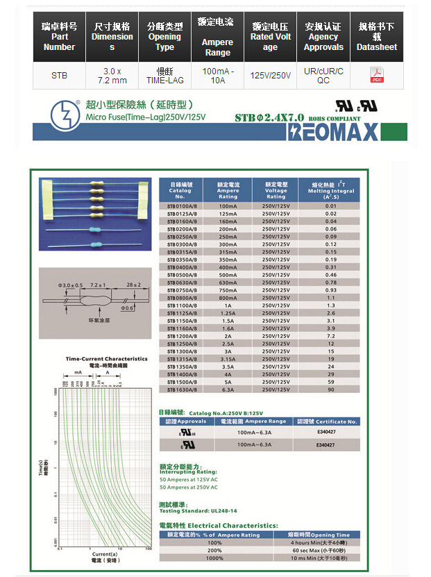 產(chǎn)品名稱(chēng): 電阻式保險(xiǎn)絲STB 3.0*7.2mm 環(huán)氧涂層(延時(shí)型)認(rèn)證齊全