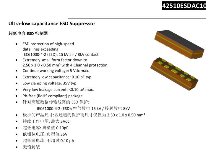 簡述: Base on Polymer Voltage Variable Material, for ESD protection with ultra-low capacitance. 2510 chip size, 4 channel 2510尺寸, 4通道