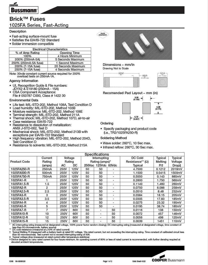 產(chǎn)品名稱: BUSSMANN 1025FA貼片式保險(xiǎn)絲 快斷 250V