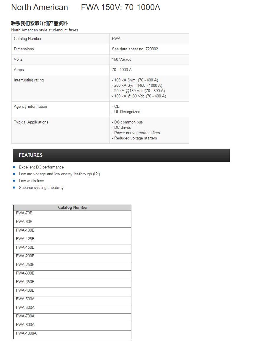 產(chǎn)品名稱: 美標 FWA 150V: 70-1000A快速熔斷器