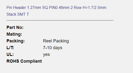 簡述: pin Header 1.27mm SQ PIN0.46mm 2 R ow h=1.7/2.5mm Stack SMT T