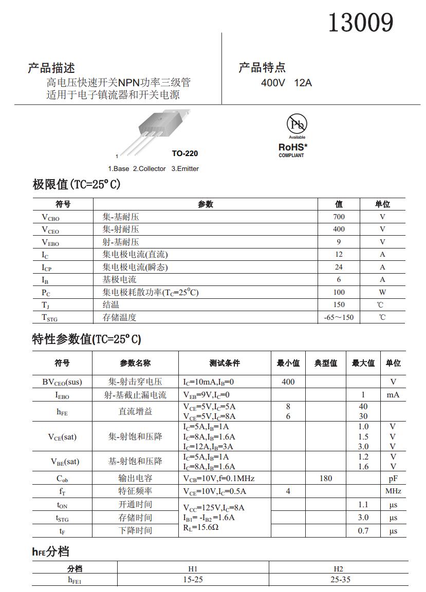 產(chǎn)品名稱: 13009 400V 12A TO-220
