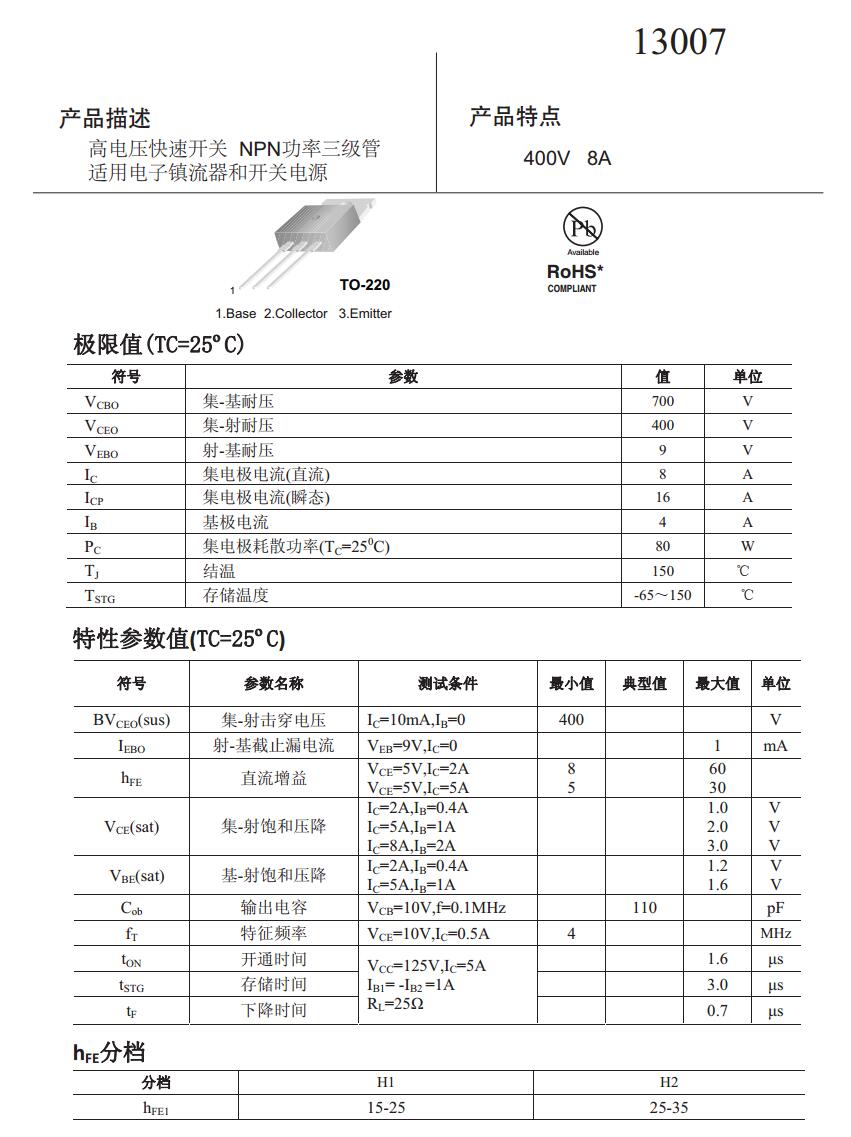 產(chǎn)品名稱: 13007 400V 8A TO-220 高電壓快速開(kāi)關(guān)NPN功率三極管