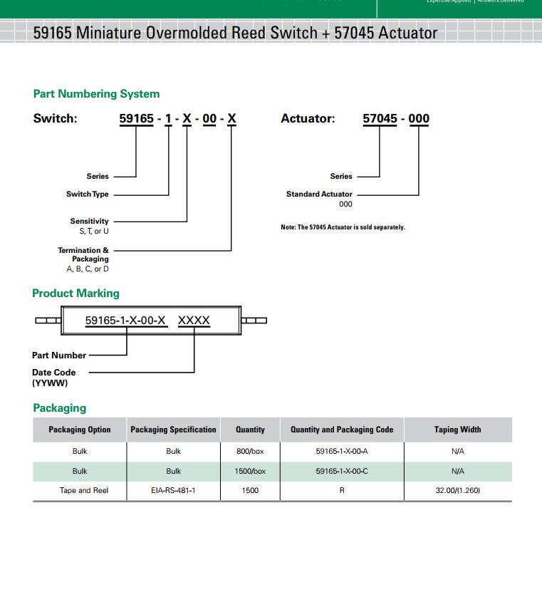 產(chǎn)品名稱(chēng): 59165 系列 - 微型包覆成型磁簧開(kāi)關(guān)|HAMLIN|干簧管