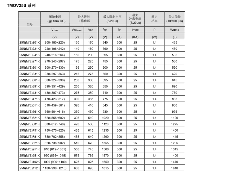 簡述: TBMOV25S系列 ?壓敏電壓從(18V-1800V) ?符合RoHS,Reach標(biāo)準(zhǔn),無鉛 ?專利的集成熱保護裝置 - ?旨在促進符合UL1449第3版SPD產(chǎn)品 ?和促進符合IEC62368 ,IEC61643-331產(chǎn)品 ?高峰值浪涌電流額定值高達(dá)25kA ?波可焊 ?標(biāo)準(zhǔn)引線形式和間距選項 ?低泄漏 ?-55°C至+ 85°C的工作溫度范圍.產(chǎn)品通過UL,TUV,CQC認(rèn)證