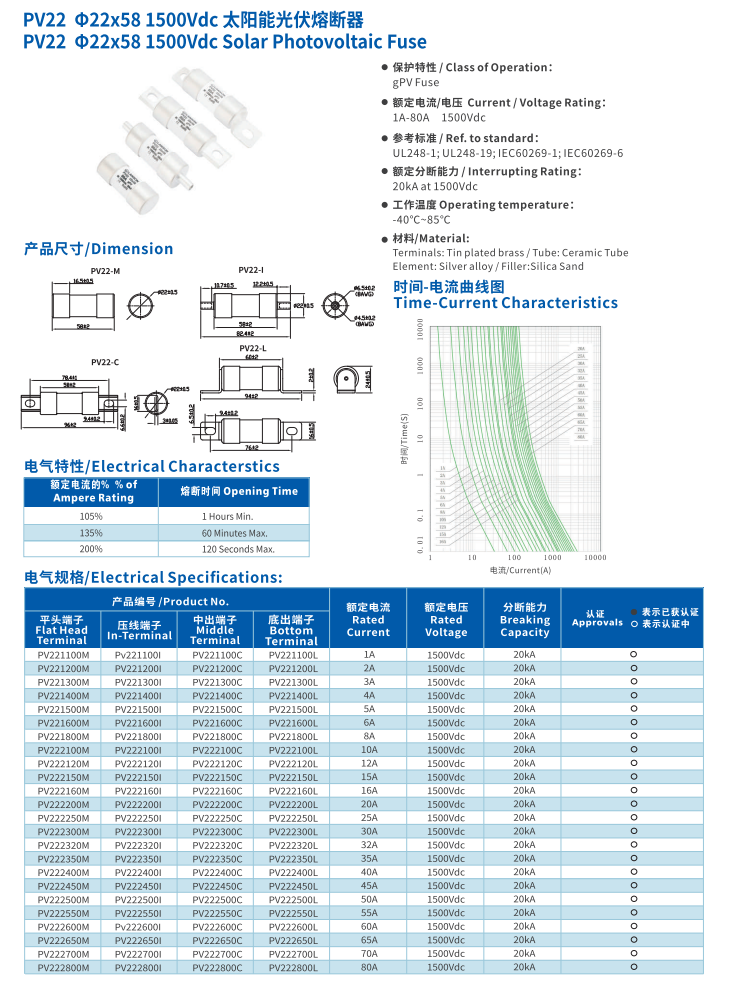 簡述: 太陽能光伏熔斷器 PV 22*58 1500VDC Photovoltaic Fuse