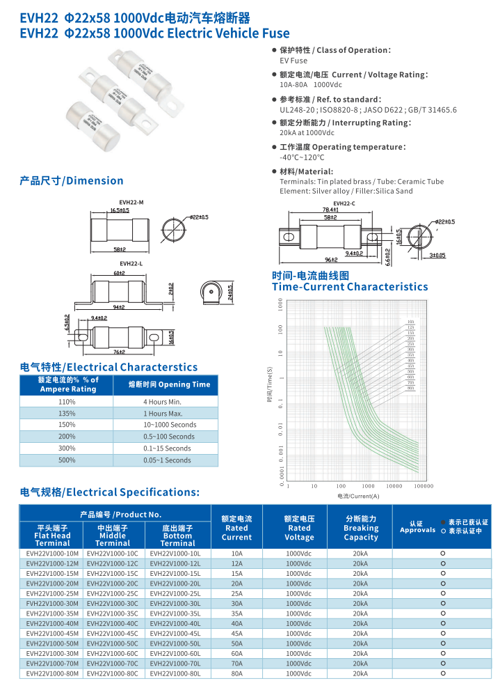 產(chǎn)品名稱: 電動(dòng)汽車熔斷器EVH22 22*58 1000VDC Electric Vehicle Fuse