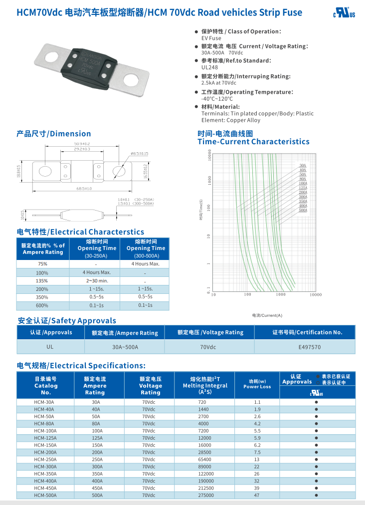 產(chǎn)品名稱: 電動(dòng)汽車板型熔斷器HCM70VDC Road vehiles Strip Fuse