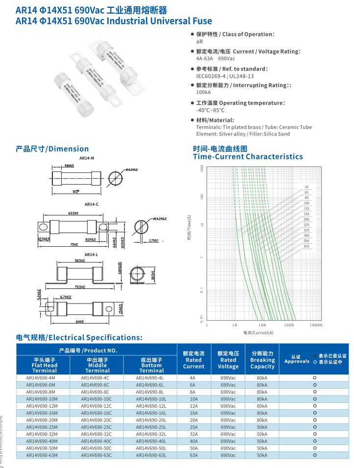 產(chǎn)品名稱: 工業(yè)通用熔斷器 AR14 14*51 690VAC INDUSTRIAL Universal Fuse