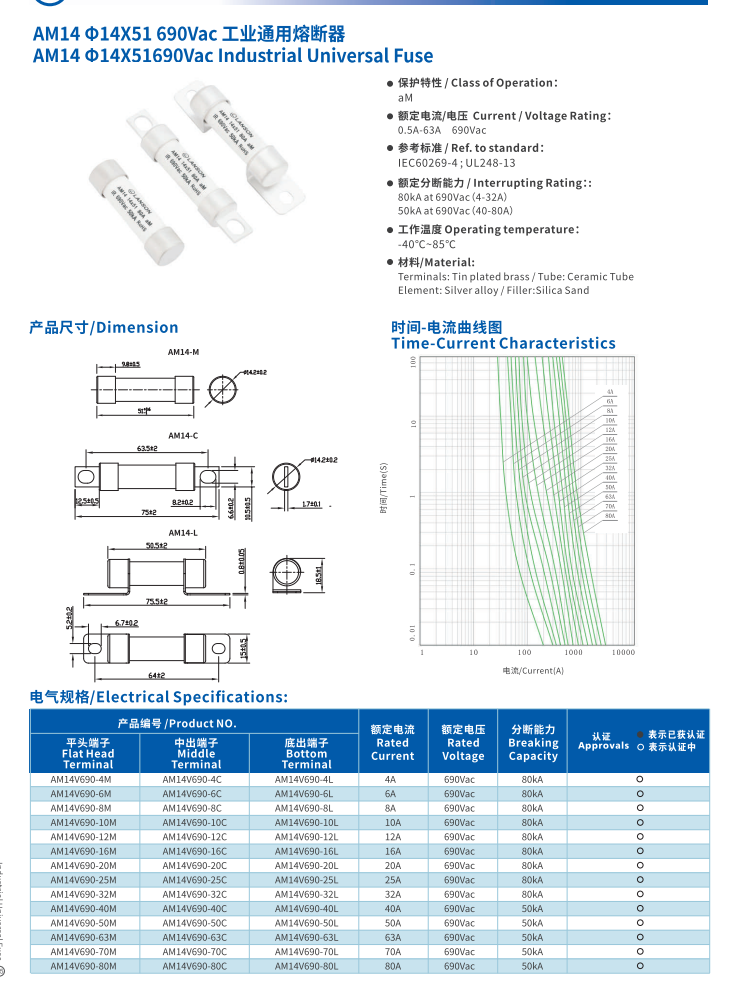 簡(jiǎn)述: 工業(yè)通用熔斷器AM14 14*51 690VAC INDUSTRIAL Universal Fuse